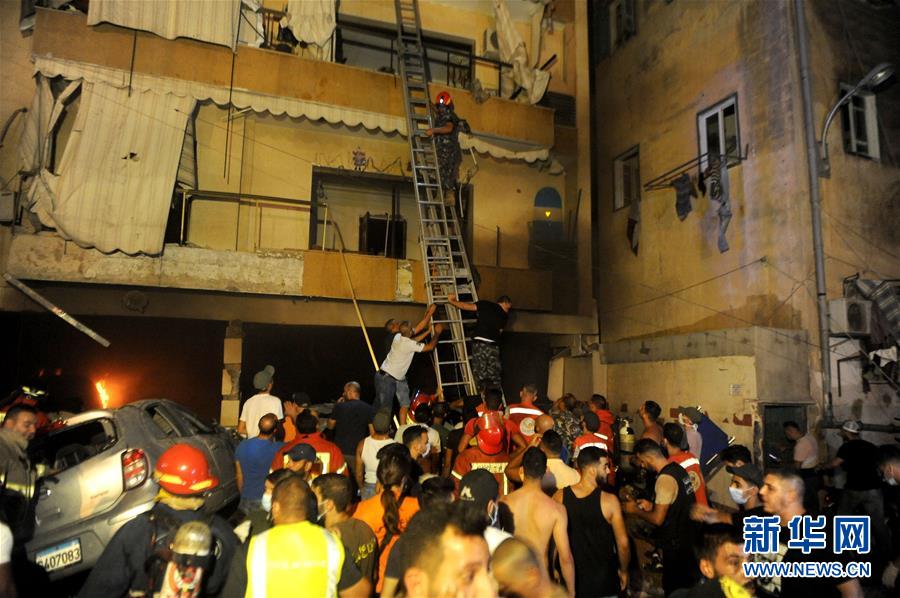 10月9日,在黎巴嫩贝鲁特,民防和消防部门人员使用消防云梯疏散楼内居民。 黎巴嫩首都贝鲁特一居民区9日发生储油罐爆炸,造成至少4人死亡、数十人受伤。 新华社发(比拉尔·贾维希摄)