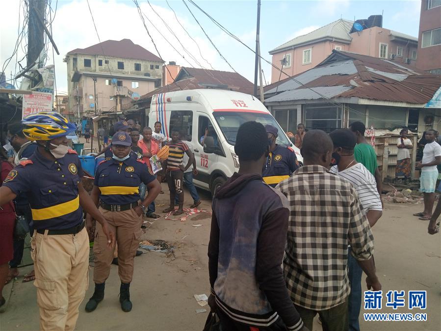 10月12日,在尼日利亚南部拉各斯市,救援人员和当地民众聚集在楼房坍塌事故现场。 尼日利亚南部拉各斯市11日发生一起在建楼房坍塌事故,已造成7人死亡、15人受伤。 新华社发(托普·阿尤库摄)