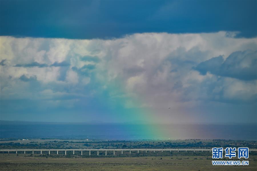 这是2020年4月29日在肯尼亚内罗毕拍摄的彩虹下的蒙内铁路。