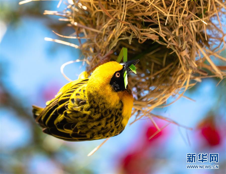 肯尼亚甜水自然保护区的一只鸟在筑巢(2019年9月29日拍摄)。新华社记者 谢晗 摄
