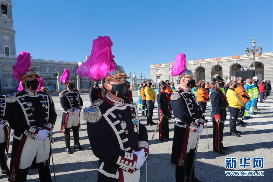 10月12日,在西班牙马德里王宫武器广场,军队、消防、医务人员等佩戴口罩参加国庆日活动。 当日,西班牙在马德里王宫举行活动,庆祝国庆日。 新华社发(西班牙国防部供图)