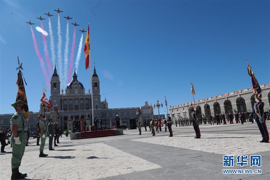 10月12日,飞机飞过西班牙马德里王宫武器广场。 当日,西班牙在马德里王宫举行活动,庆祝国庆日。 新华社发(西班牙国防部供图)