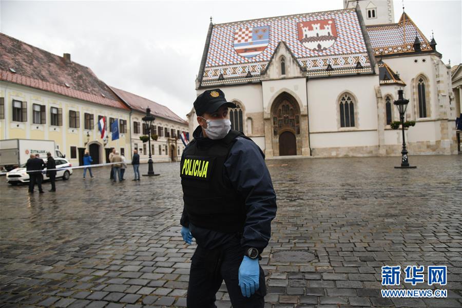10月12日,一名警察在位于克罗地亚首都萨格勒布圣马可广场的政府大楼附近戒备。 克罗地亚内务部网站12日发布消息说,一名枪手当天上午在位于首都萨格勒布的克政府大楼外开枪扫射,致一名警察受伤,枪手逃离现场后自杀身亡。 新华社发(雷戈维奇摄)