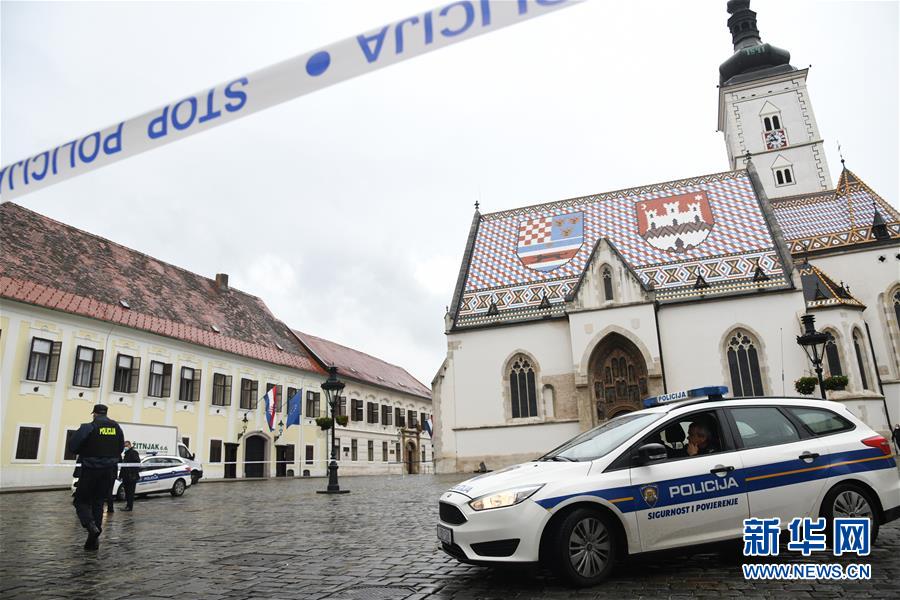 10月12日,警车在位于克罗地亚首都萨格勒布圣马可广场的政府大楼附近戒备。 克罗地亚内务部网站12日发布消息说,一名枪手当天上午在位于首都萨格勒布的克政府大楼外开枪扫射,致一名警察受伤,枪手逃离现场后自杀身亡。 新华社发(雷戈维奇摄)