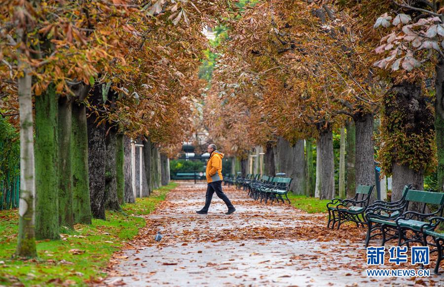 10月12日,一名市民在奥地利维也纳人民公园内行走。 新华社记者 郭晨 摄