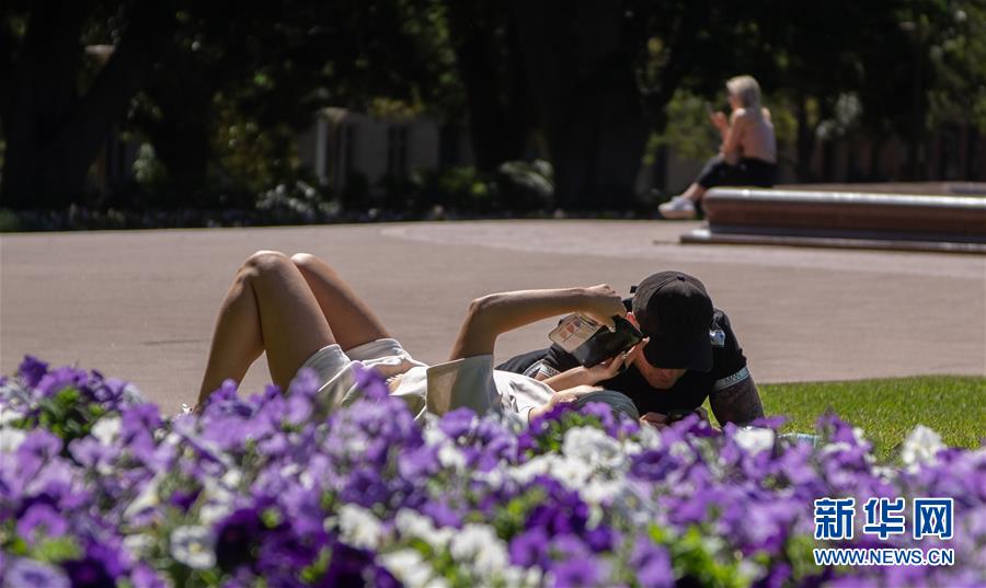 10月12日,在澳大利亚悉尼,市民在海德公园步道鲜花旁休憩。新华社发 (胡泾辰摄)