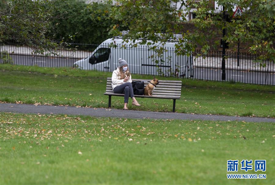 10月12日,一名女子戴口罩在英国伦敦一处公园里休闲。 英国政府11日报告显示英国新冠累计确诊病例已超过60万例。 新华社记者 韩岩 摄