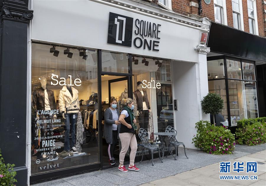 10月12日,顾客戴着口罩走出英国伦敦一家服装店。 英国首相约翰逊12日公布了一个适用于英格兰的三级新冠警戒系统,每一级别对应不同的疫情严重程度以及相应的应对措施,以进一步规范和简化英格兰各地落实疫情防控措施的程序。 新华社记者 韩岩 摄