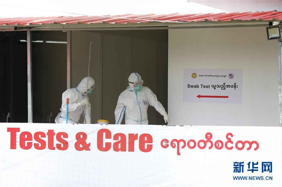10月13日,身着防护服的志愿者在缅甸仰光的新冠检测和治疗中心工作。 缅甸卫生和体育部13日晚间发布的新冠疫情数据显示,过去24小时该国新增新冠确诊病例1123例,累计确诊30437例;新增死亡29例,累计死亡693例;累计治愈11769例。 新华社发(吴昂 摄)