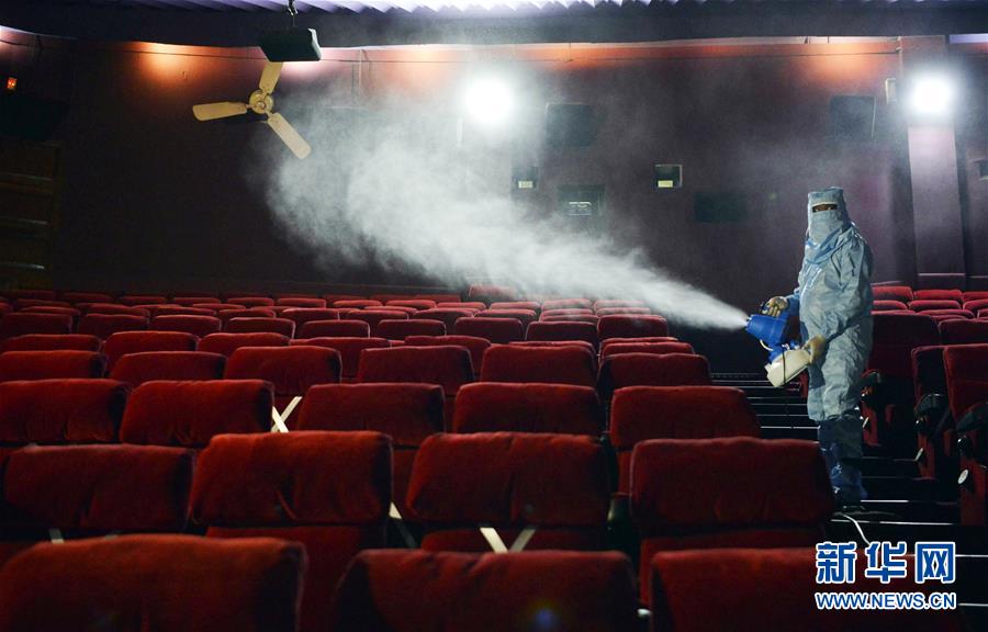 10月13日,在印度新德里一座电影院,一名工作人员给影厅消毒。 印度内政部10月1日声明说,印度国内将从10月15日起允许电影院、剧院以可容纳人员上限50%的规模开放。 新华社发