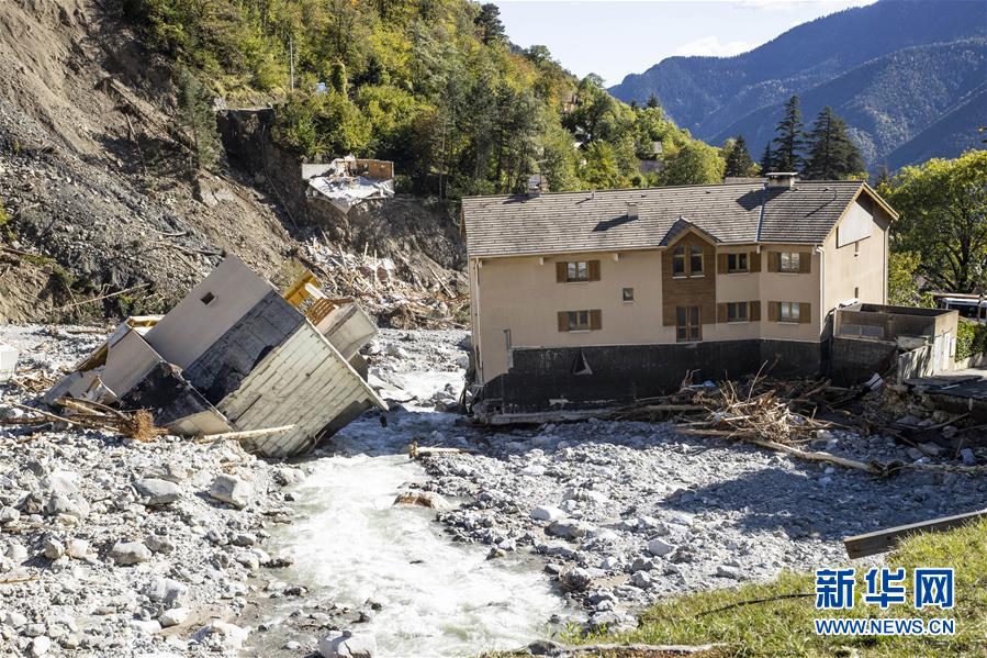 这是10月12日在法国南部城市尼斯附近的圣马丹韦叙比拍摄的洪灾过后被损坏的房屋。 法国和意大利交界地区近期遭遇暴雨及洪水,造成法国境内多处房屋、桥梁和公路被毁。 新华社发(法布里斯·桑佩尔摄)