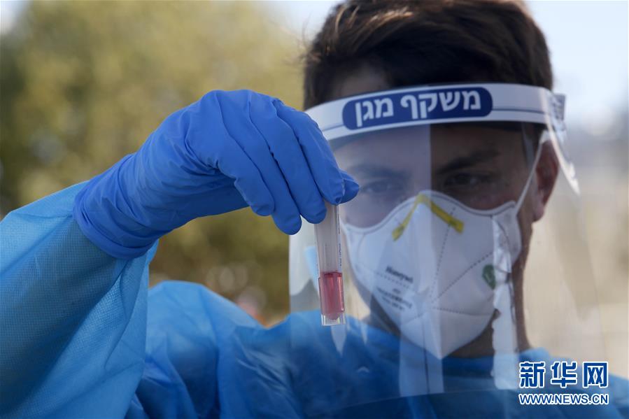 10月13日,在位于以色列中部城市佩塔提克瓦的一处新冠病毒检测站内,医务人员展示一个样本。 以色列内阁13日批准,将原本于14日到期的全国性“封城”措施延长至18日午夜,这是该国第二次宣布延长“封城”。 新华社发(吉尔·科恩·马根摄)