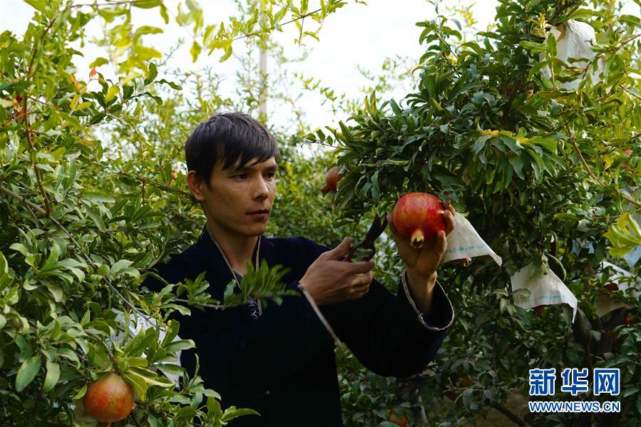 10月11日,一名种植户在乌兹别克斯坦苏尔汉河州采摘石榴。 金秋时节,位于乌兹别克斯坦东南部地区的苏尔汉河州的石榴进入采摘旺季,种植户抢抓农时进行采摘、销售。 新华社发(扎法尔摄)