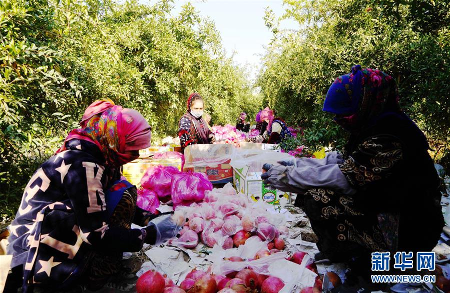 10月11日,种植户在乌兹别克斯坦苏尔汉河州包装石榴。 金秋时节,位于乌兹别克斯坦东南部地区的苏尔汉河州的石榴进入采摘旺季,种植户抢抓农时进行采摘、销售。 新华社发(扎法尔摄)