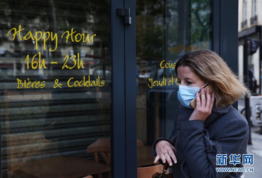 10月14日,一名路人经过一家停业的酒吧。 法国总统马克龙14日晚宣布,将从17日起在法兰西岛大区(大巴黎地区)和其他8个大城市实施宵禁,以遏制新冠疫情。 新华社记者高静摄
