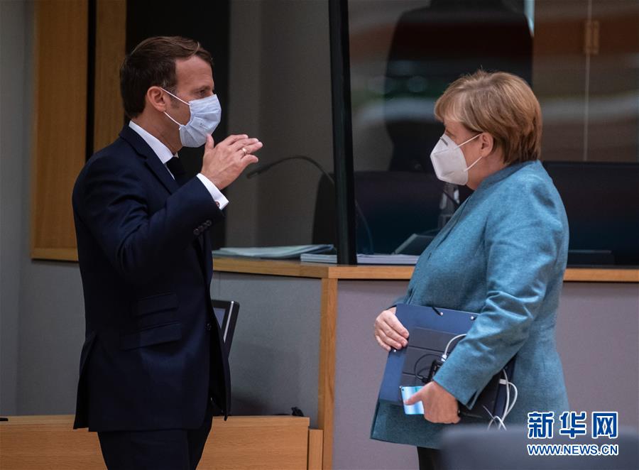 10月15日,在比利时布鲁塞尔的欧盟总部,德国总理默克尔(右)与法国总统马克龙在欧盟秋季峰会召开前交谈。 10月15日,欧盟秋季峰会在比利时首都布鲁塞尔开幕。 新华社发(欧盟供图)
