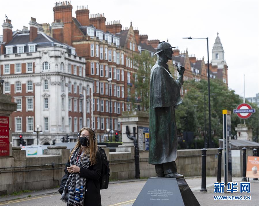 10月15日,一名戴口罩的女子从英国伦敦贝克街地铁站前的福尔摩斯雕塑旁走过。 英国政府15日宣布,经过对新冠疫情形势的评估,决定把伦敦等地区的新冠警戒级别从“中等”提升至“高”,这些地区相应地也会采取更严格的防控措施。 新华社记者韩岩摄