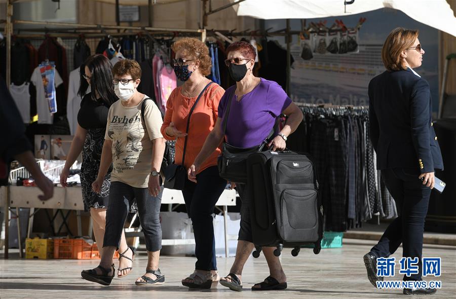 10月16日,行人佩戴口罩走在马耳他首都瓦莱塔街头。 马耳他新冠疫情反弹,根据该国卫生部门16日公布的数据,当天新增确诊病例122例,累计确诊达4282例。 新华社发(乔纳森·博格 摄)