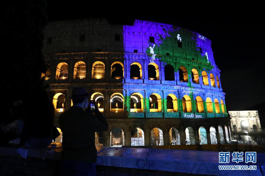 10月16日,在意大利首都罗马,人们在斗兽场前观看庆祝粮农组织成立75周年的光影视觉秀。 总部位于罗马的联合国粮食及农业组织(粮农组织)和意大利政府16日举行多项活动,庆祝世界粮食日。今年的世界粮食日主题是“齐成长、同繁荣、共持续,行动造就未来”。 新华社发(联合国粮农组织供图)