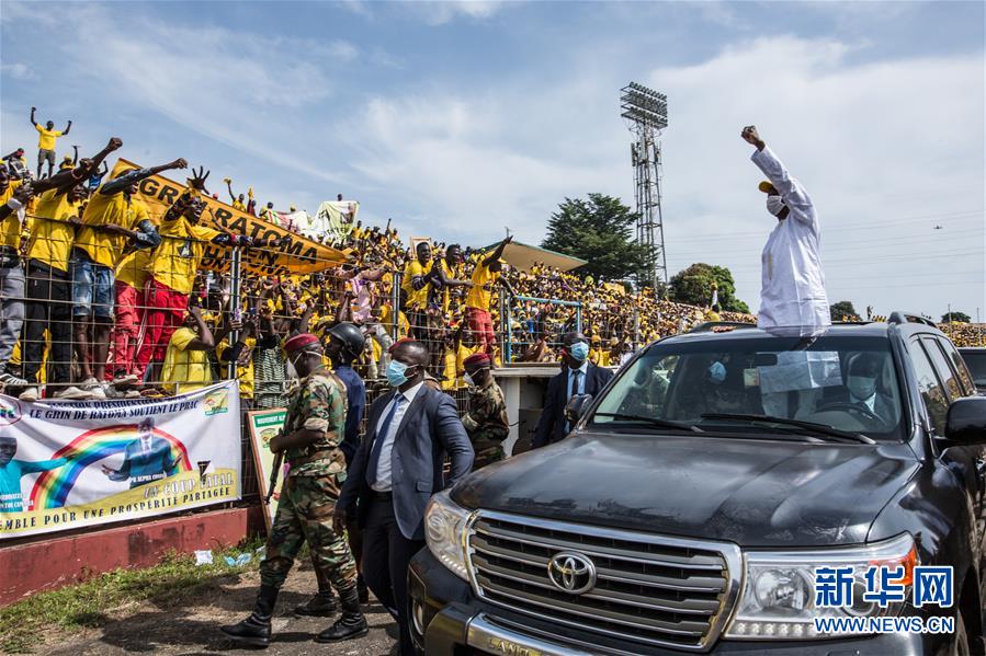10月16日,在几内亚首都科纳克里,几内亚总统孔戴(右)乘车进入竞选活动现场。新华社发(埃迪·皮特斯 摄)