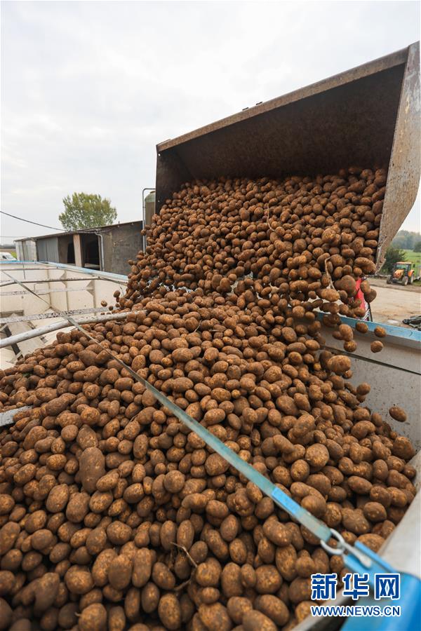 10月17日,工作人员在比利时埃诺省阿特市的农业与农业工程中心试验农场将土豆装车,准备运往薯条加工厂。 土豆是比利时的主要农作物之一,也是当地深受欢迎的食材。 新华社记者 郑焕松 摄