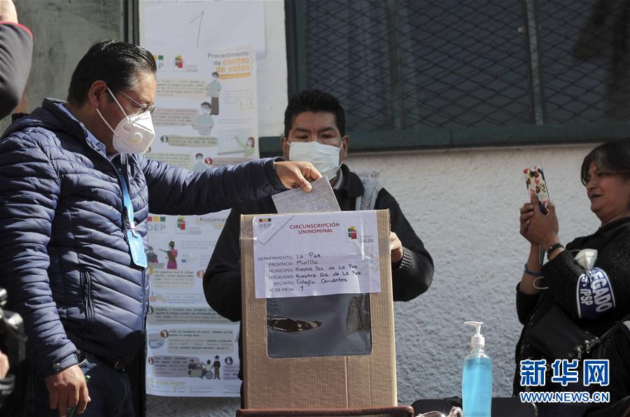 10月18日,在玻利维亚首都拉巴斯一处投票站,玻利维亚“争取社会主义运动”候选人、前经济部长路易斯·阿尔塞(左)参加投票。 玻利维亚18日举行总统和议会选举。玻利维亚全国730万选民将投票选出新总统,同时还将选出一名副总统、130名众议员和36名参议员。 新华社发