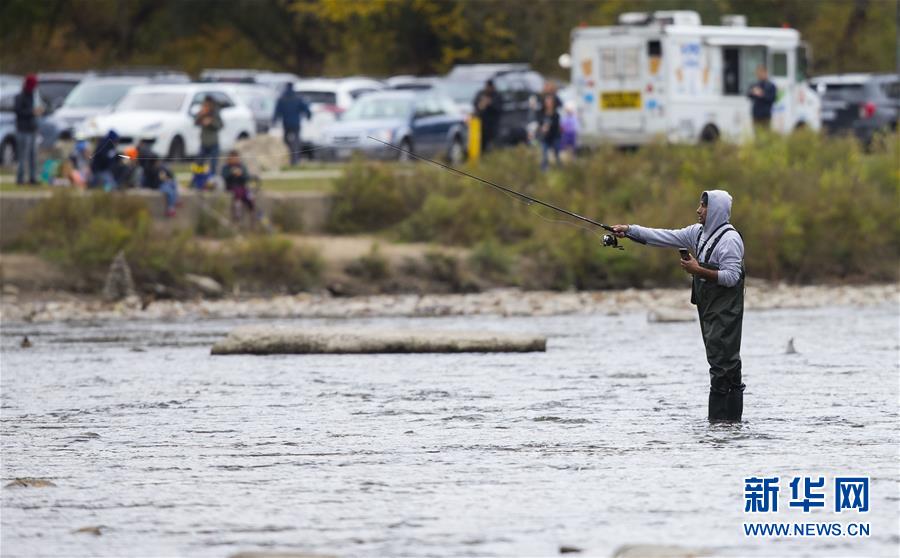 10月18日,在加拿大多伦多,人们在亨伯河边观看三文鱼洄游。 加拿大安大略省近日进入三文鱼洄游季,成群结队的三文鱼从大海中游回出生地繁殖,形成一道风景,吸引不少游人和垂钓者。 新华社发(邹峥摄)