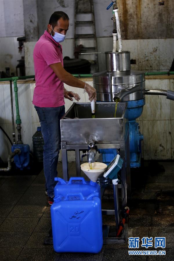 10月18日,在黎巴嫩南部一家榨油坊,一名工人把新榨出来的橄榄油装桶。 黎巴嫩南部一些地区至今依然保留着用传统石碾压榨橄榄油的做法。 新华社发(比拉尔·贾维希摄)