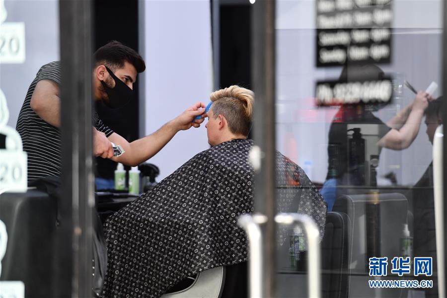 10月19日,市民在澳大利亚墨尔本市中心的一家理发店理发。 澳大利亚第二大城市墨尔本从19日开始进一步放松新冠疫情管控措施,澳总理莫里森对此表示欢迎。此外,澳第一大城市悉尼所在的新南威尔士州也在逐步放松管控措施。 新华社发(白雪 摄)