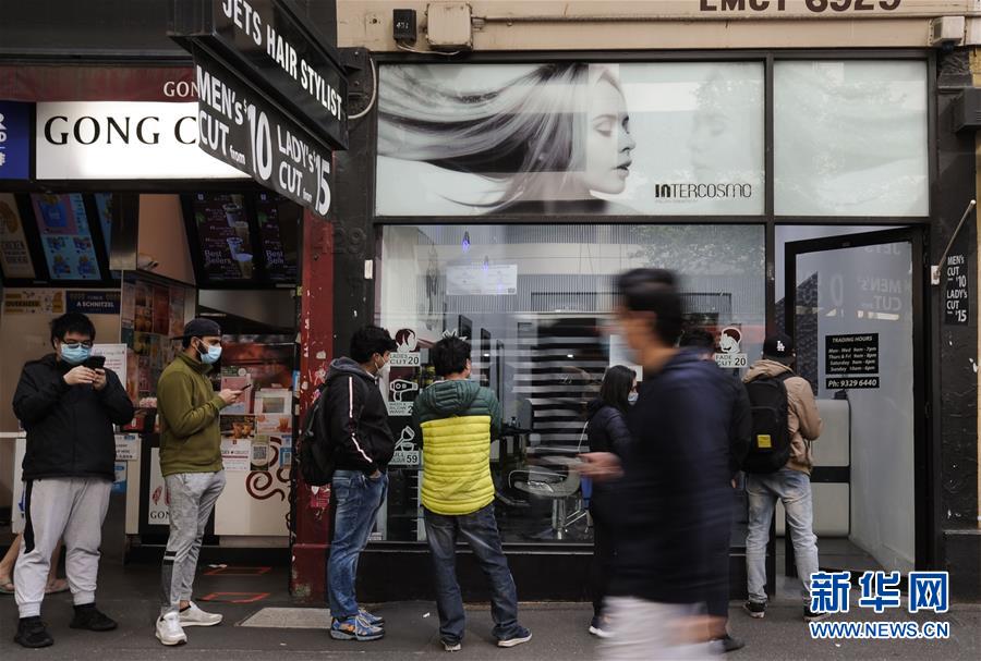 10月19日,市民在澳大利亚墨尔本市中心的一家理发店外排队。 澳大利亚第二大城市墨尔本从19日开始进一步放松新冠疫情管控措施,澳总理莫里森对此表示欢迎。此外,澳第一大城市悉尼所在的新南威尔士州也在逐步放松管控措施。 新华社发(白雪 摄)
