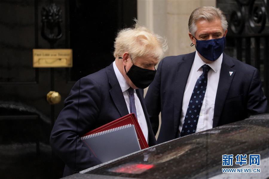 10月21日,英国首相鲍里斯·约翰逊(左)离开位于伦敦的首相府,准备前往议会。新华社发(蒂姆·爱尔兰摄)