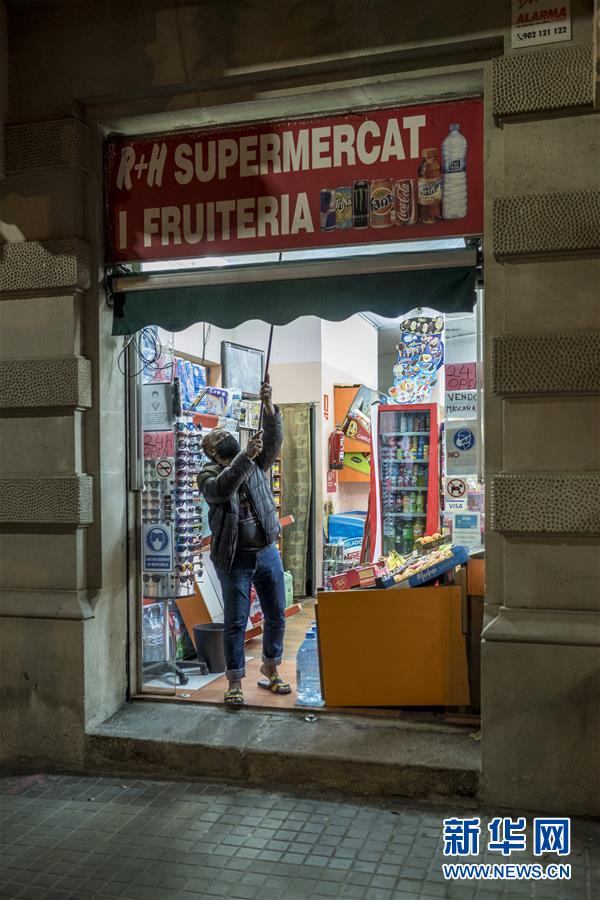 10月20日晚,在西班牙巴塞罗那,一家24小时商店的店主准备关闭店铺。新华社发(胡安·戈萨摄)