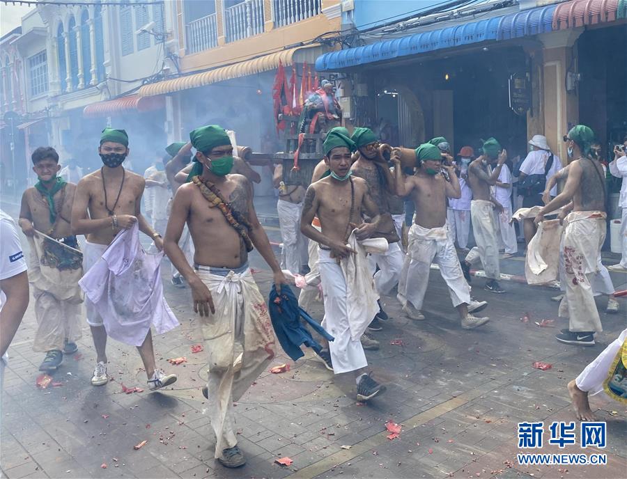 10月22日,民众参加在泰国普吉举办的斋节庆祝游行。 九皇斋节又称素食节、吃斋节,每年阴历九月举行,最早流行在泰国南部普吉府地区,后来逐渐普及到泰国全境,成为泰国华人的年度盛会,白衣素食是节日的主要特色。 新华社记者 张可任 摄