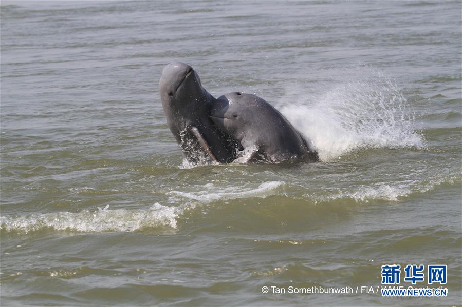 世界自然基金会提供的资料图片显示伊洛瓦底江豚在柬埔寨桔井省内的湄公河段嬉戏。 世界自然基金会和柬埔寨渔业管理局22日发布普查报告称,柬境内湄公河流域的伊洛瓦底江豚种群数量在过去4年中保持稳定,2017年统计有92头,2020年估计有89头。伊洛瓦底江豚是一种生活在淡水中的短吻豚类,于2004年被列入世界自然保护联盟濒危物种红色名录。 新华社发(世界自然基金会供图)