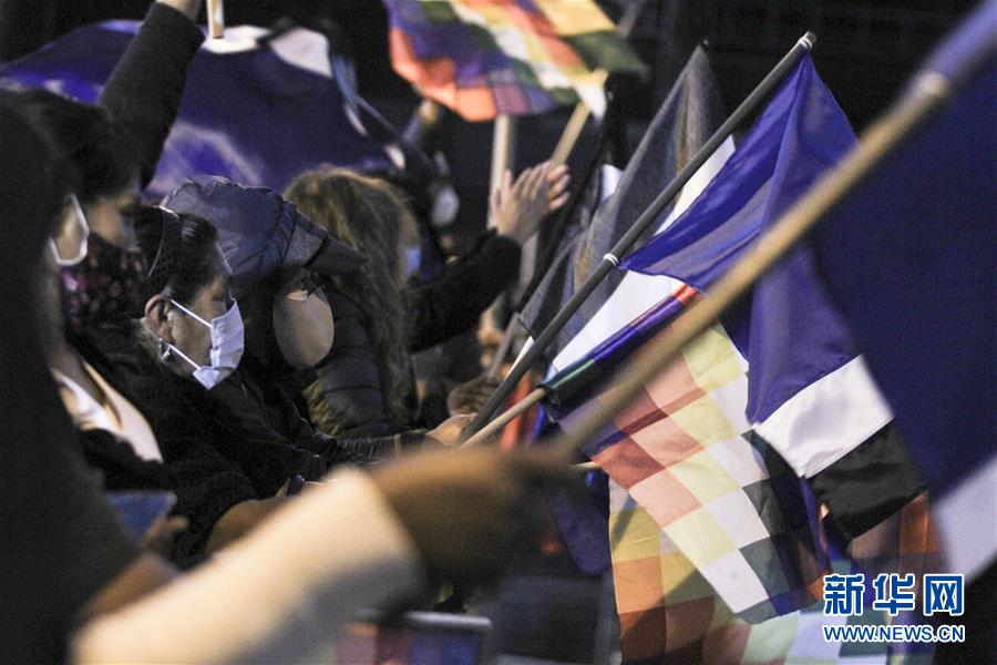10月23日,玻利维亚“争取社会主义运动”党支持者在拉巴斯庆祝赢得选举。 玻利维亚最高选举法院23日宣布,“争取社会主义运动”候选人、前经济部长路易斯·阿尔塞在18日举行的总统选举中获胜,当选新一任玻利维亚总统。 新华社发(马特奥·罗迈摄)