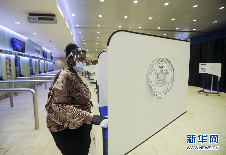 10月24日,在美国纽约麦迪逊花园广场投票点,一名工作人员清洁填票桌。 纽约州2020美国大选提前投票当日启动。美国大选投票日是11月3日,但多地已经开始提前投票。 新华社记者 王迎 摄