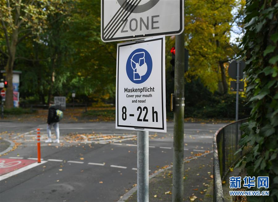 这是10月24日在德国法兰克福拍摄的一处提醒人们佩戴口罩的警示牌。 德国疾控机构罗伯特·科赫研究所24日公布的数据显示,截至当天零时,德国较前一日新增新冠确诊病例14714例,累计确诊418005例;新增死亡49例,累计死亡10003例。 新华社记者 逯阳 摄