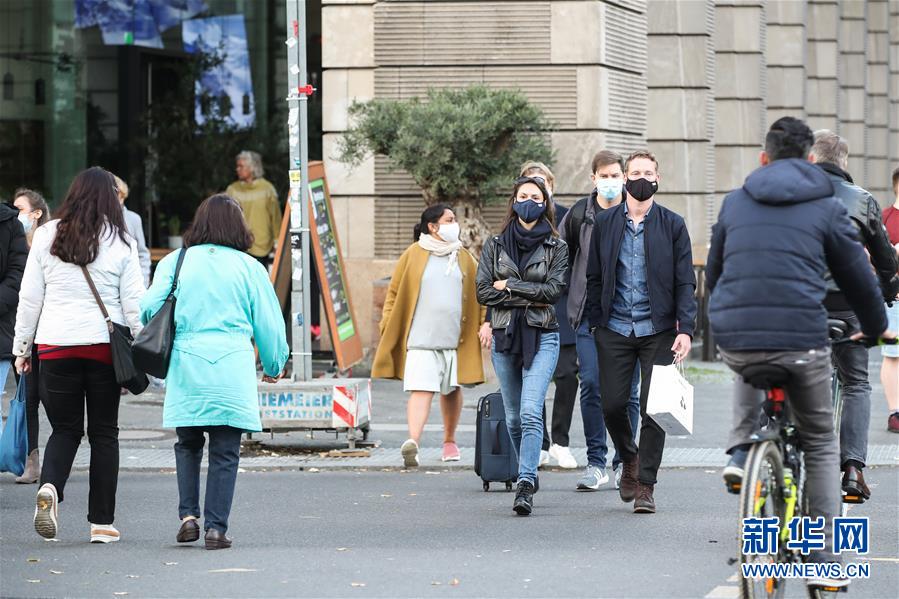 10月24日,在德国首都柏林,佩戴口罩的行人穿过一条街道。 德国疾控机构罗伯特·科赫研究所24日公布的数据显示,截至当天零时,德国较前一日新增新冠确诊病例14714例,累计确诊418005例;新增死亡49例,累计死亡10003例。 新华社记者 单宇琦 摄