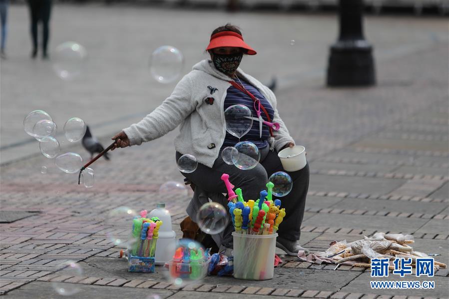 10月24日,戴着口罩的商贩在哥伦比亚首都波哥大招徕顾客。 哥伦比亚卫生和社会保障部24日公布的数据显示,该国累计新冠确诊病例1007711例,累计死亡病例3万例。 新华社发(约翰·帕斯摄)