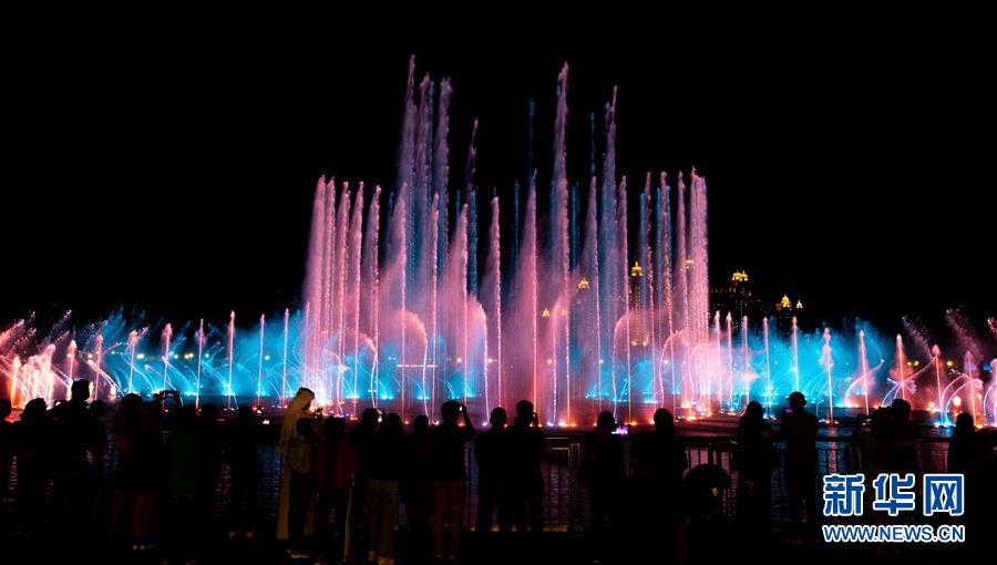 10月24日晚,在阿拉伯联合酋长国迪拜棕榈岛,当地居民和游客欣赏音乐喷泉表演。 吉尼斯世界纪录认证的世界最大喷泉——迪拜棕榈岛音乐喷泉24日进入表演季。该项目设计和制造商为北京中科水景科技有限公司,音乐喷泉表演将从每天日落后开始,每30分钟一次直至午夜,每场表演约3分钟,音乐涵盖古典、流行等多种风格。 新华社发