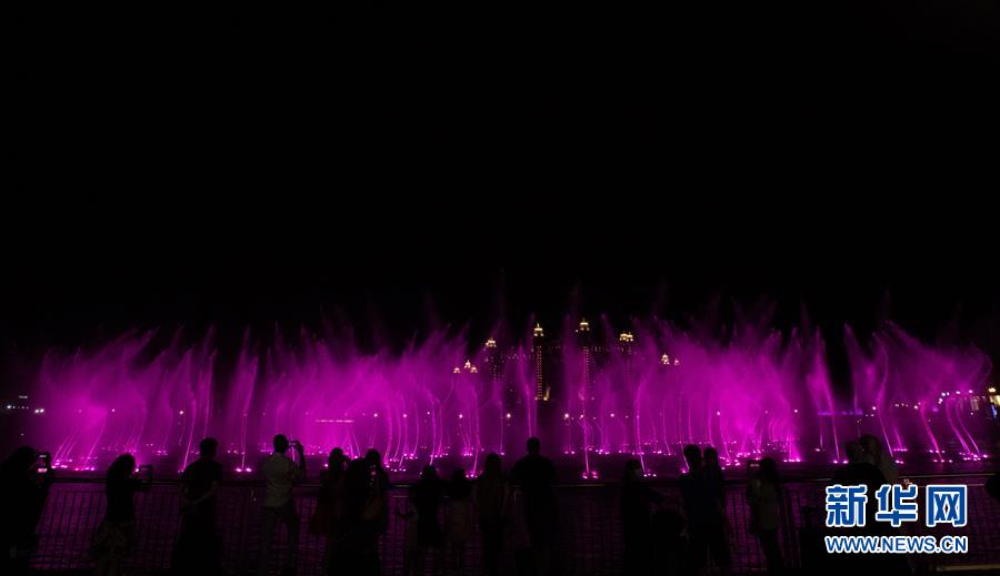 10月24日晚,在阿拉伯联合酋长国迪拜棕榈岛,当地居民和游客欣赏音乐喷泉表演。 吉尼斯世界纪录认证的世界最大喷泉——迪拜棕榈岛音乐喷泉24日进入表演季。该项目设计和制造商为北京中科水景科技有限公司,音乐喷泉表演将从每天日落后开始,每30分钟一次直至午夜,每场表演约3分钟,音乐涵盖古典、流行等多种风格。 新华社发