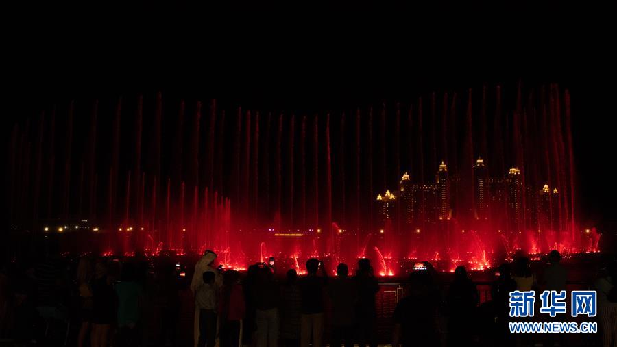 10月24日晚,在阿拉伯联合酋长国迪拜棕榈岛,当地居民和游客欣赏音乐喷泉表演。 吉尼斯世界纪录认证的世界最大喷泉——迪拜棕榈岛音乐喷泉24日进入表演季。该项目设计和制造商为北京中科水景科技有限公司,音乐喷泉表演将从每天日落后开始,每30分钟一次直至午夜,每场表演约3分钟,音乐涵盖古典、流行等多种风格。 新华社发
