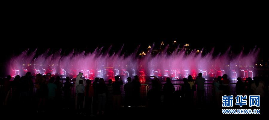 10月24日晚,在阿拉伯联合酋长国迪拜棕榈岛,当地居民和游客欣赏音乐喷泉表演。 吉尼斯世界纪录认证的世界最大喷泉——迪拜棕榈岛音乐喷泉24日进入表演季。该项目设计和制造商为北京中科水景科技有限公司,音乐喷泉表演将从每天日落后开始,每30分钟一次直至午夜,每场表演约3分钟,音乐涵盖古典、流行等多种风格。 新华社发