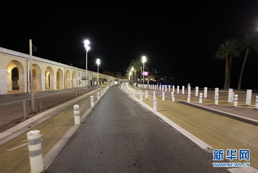 这是10月24日晚在法国南部城市尼斯拍摄的宵禁后的城市街道。新华社发(塞尔日·阿乌齐摄)