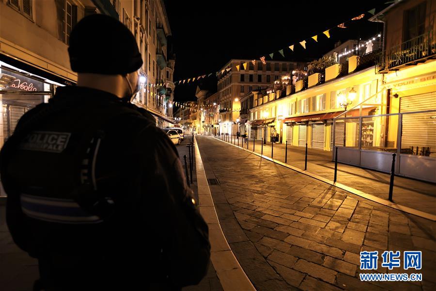 10月24日晚,在法国南部海滨城市尼斯,警察在宵禁后的街道上巡逻。新华社发(塞尔日·阿乌齐摄)
