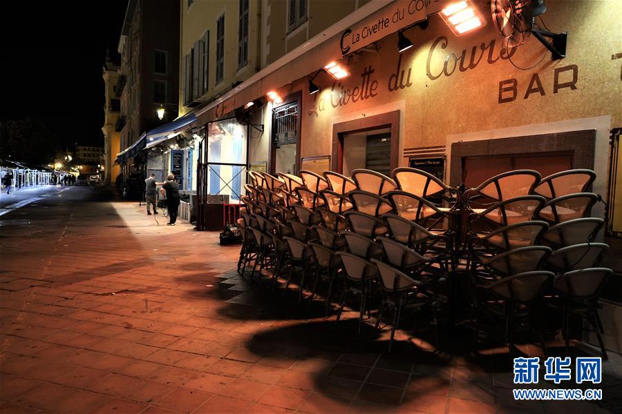 10月24日晚,在法国南部海滨城市尼斯,餐馆在晚九点宵禁前打烊。新华社发(塞尔日·阿乌齐摄)