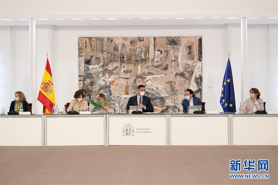 这是10月25日在西班牙马德里的首相府拍摄的内阁特别会议现场。 西班牙首相桑切斯25日宣布,该国再次进入国家紧急状态,以遏制新冠疫情蔓延。桑切斯在首相府举行的视频新闻发布会上说,西班牙当天举行内阁特别会议,决定自25日下午开始在全国实施新一轮国家紧急状态,以期将全国每10万人中确诊病例数降至25例以下。 新华社发(西班牙首相府供图)