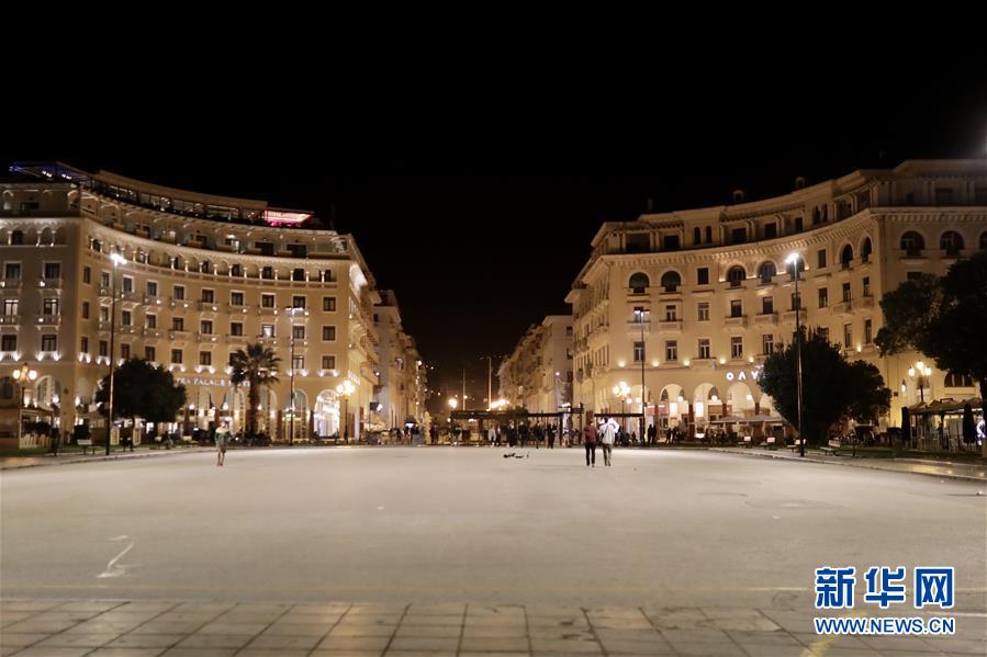这是10月25日凌晨在希腊塞萨洛尼基拍摄的空旷街道。 为防控疫情,希腊对多个地区实施宵禁等管控措施。 新华社发(莱夫泰里斯·帕特萨利斯摄)