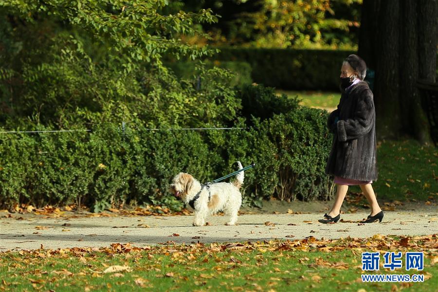 10月26日,一名女子在比利时布鲁塞尔的五十周年纪念公园里遛狗。 比利时国家公共卫生研究所26日发布的新冠疫情数据显示,该国近两周日均新增确诊病例10579.2例,目前累计确诊病例达321031例。 新华社记者 郑焕松 摄