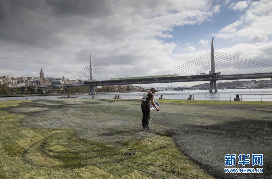 10月22日,在土耳其伊斯坦布尔,法国艺术家纪尧姆·勒格罗在绘制巨幅露天绘画作品。 新华社发(奥斯曼·厄尔萨尔 摄)